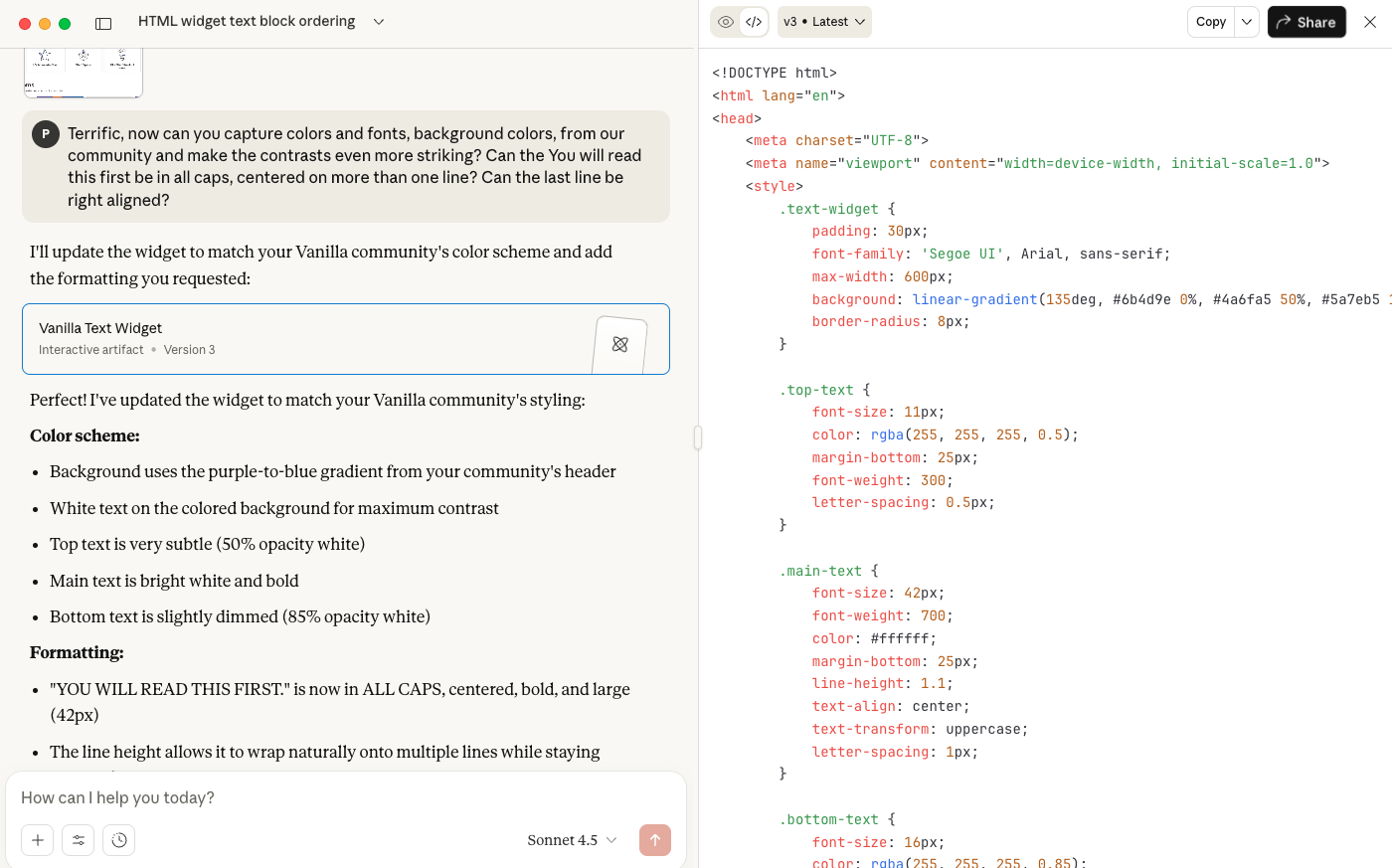 If you're a community manager, you understand Community — not just the platforms that they run on. Your super-power is facilitating conversations and getting eyeballs to go where they should, not mucking around with software. You have ideas that you would love to execute but lack the time and technical resources to do them. Your time (and resource) has come. Let's use AI to build a simple HTML widget in Vanilla, just for fun.
