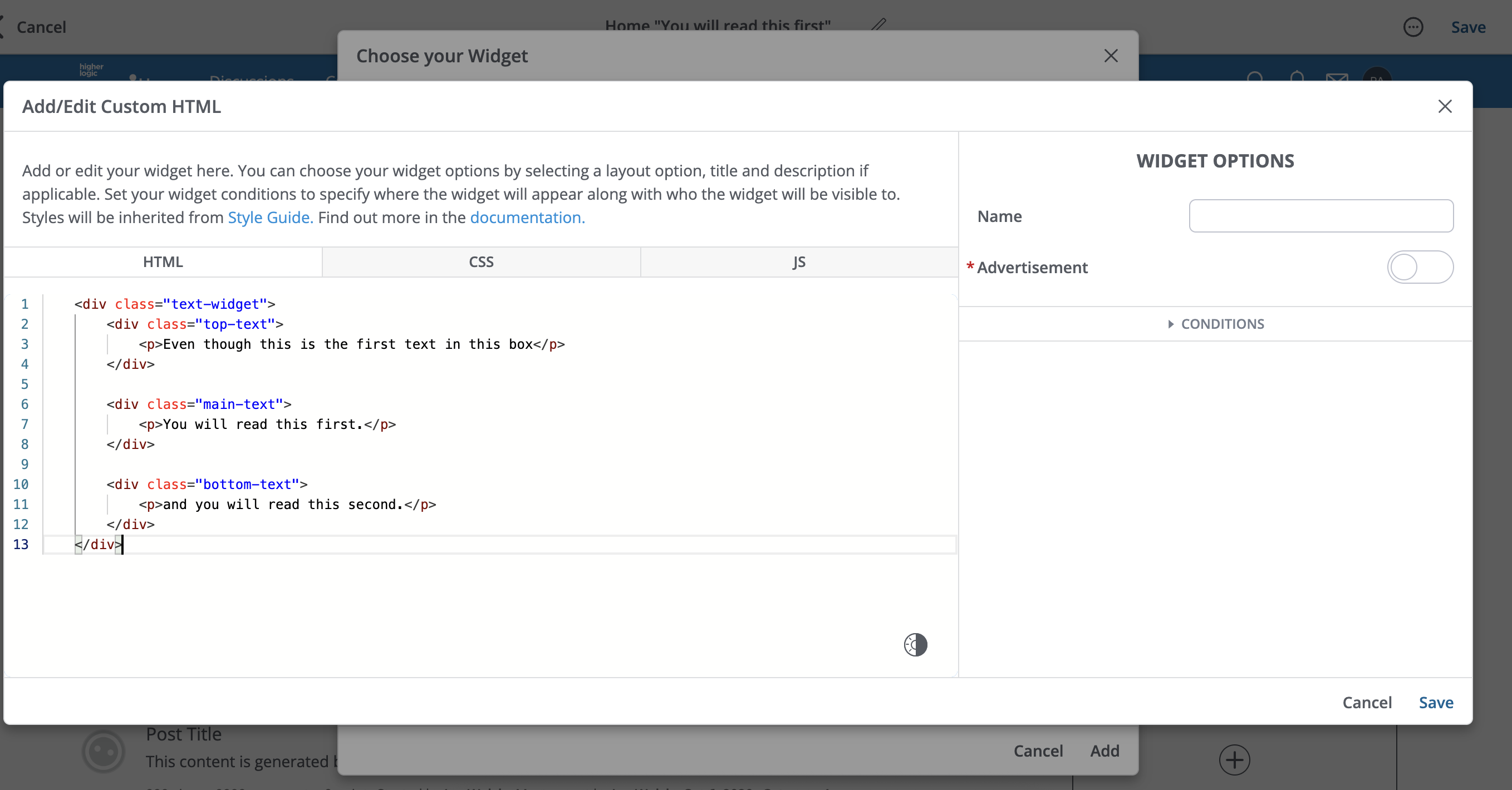 Hi Claude, I want to build an HTML widget for my Vanilla community that is simply HTML and text. I want there to be three blocks of text in this order:
