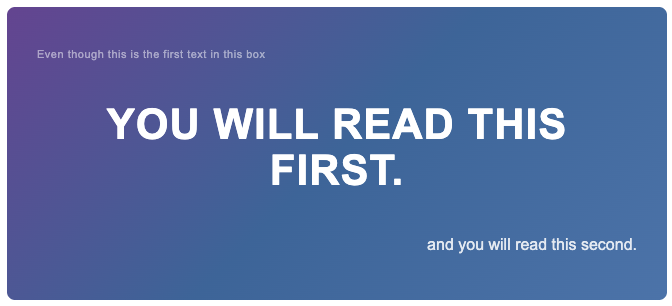"Even though this is the first text in this box" is actually the highest placed block on the page, "You will read this first" is the second block on the page, followed by "and you will read this second" is the third block. And the CSS is designed to make the "You will read this first" visually more prominent and the "Even though this is the first text in this box" is visually less striking and is, therefore, the last thing a reader's eye is drawn to.