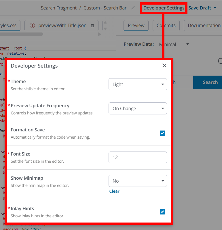 Click Developer Settings at the top-right of the editor to access the following settings: