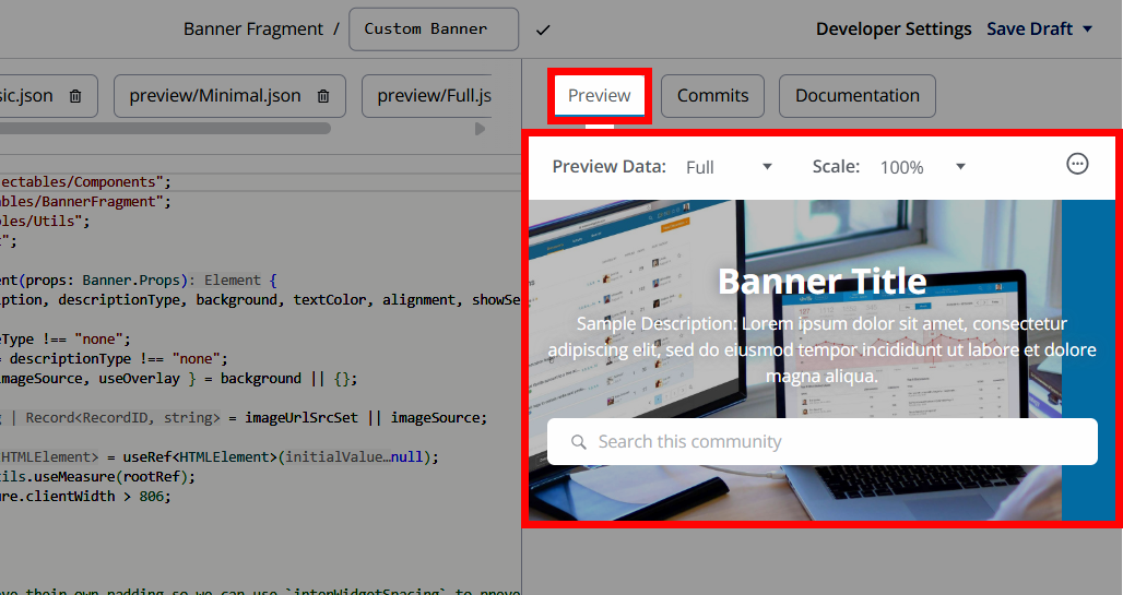 While working in Widget Builder, a preview of your code and CSS is displayed in the right-hand panel, making it easy to see and verify your changes as you work. The preview renders your in-progress widget or fragment with real platform injectables and sample data, so you can validate JSX/CSS and behavior before publishing.