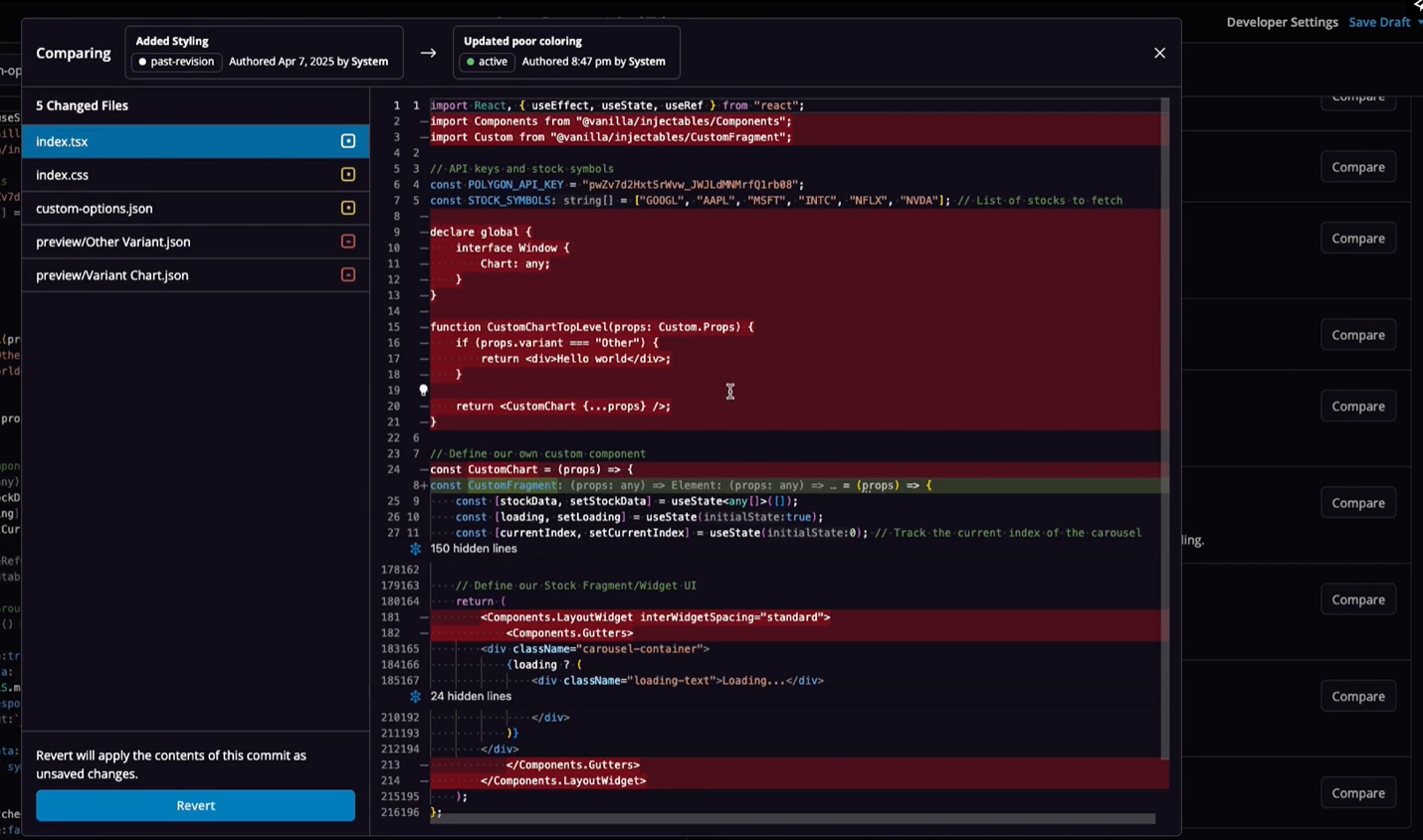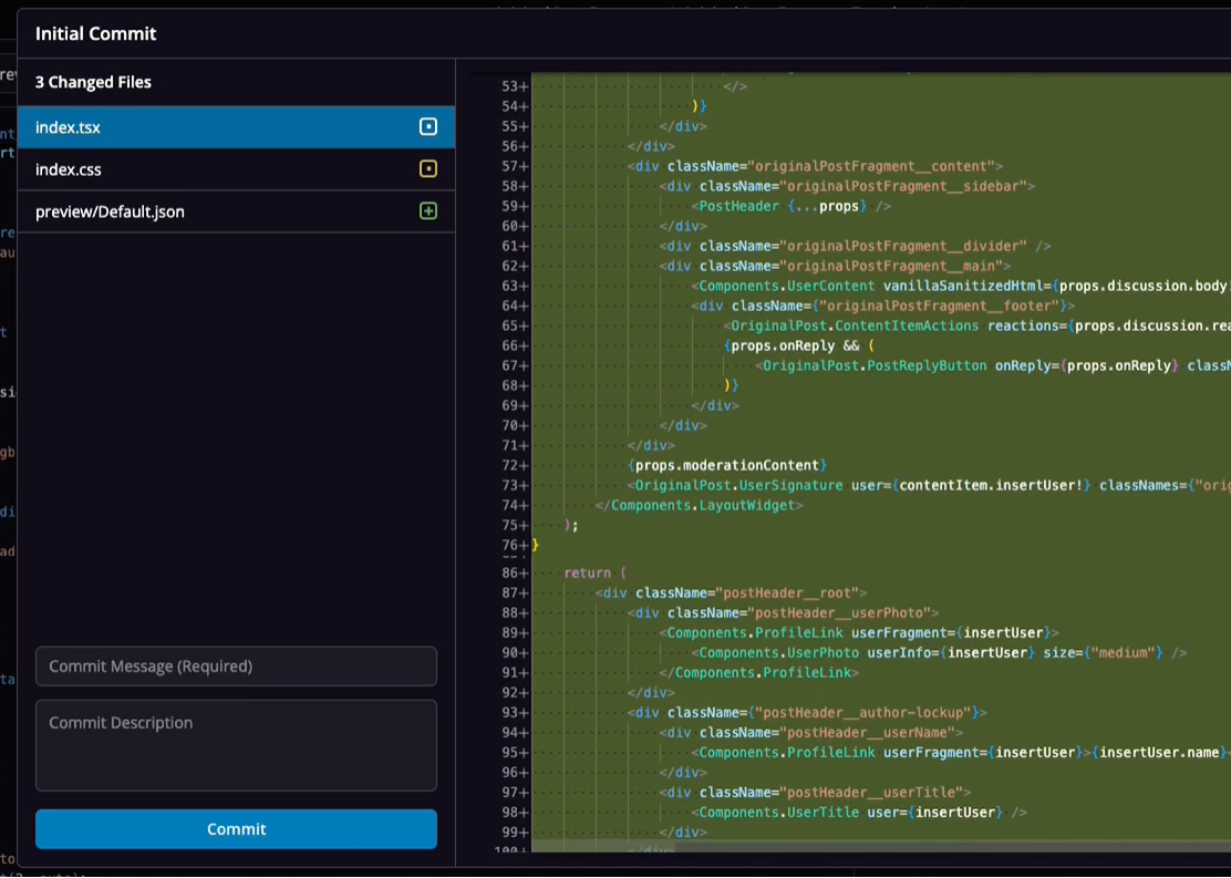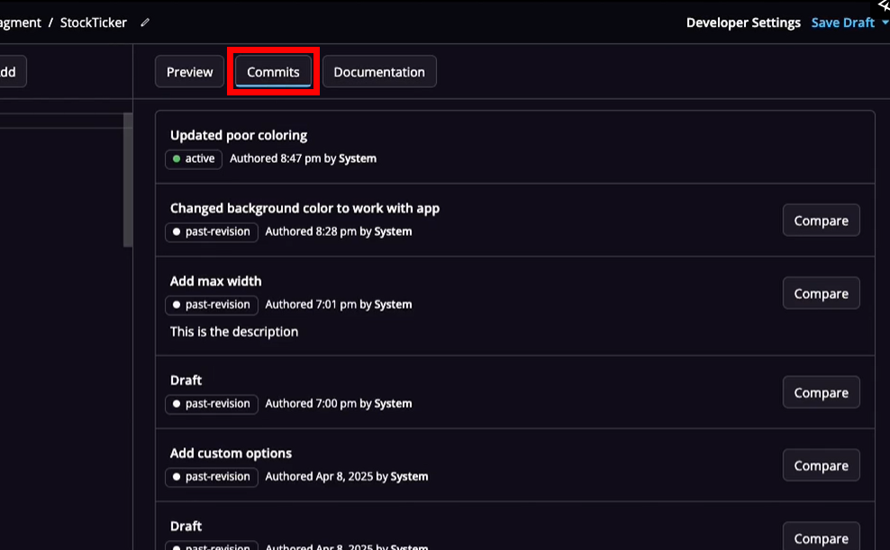 Each commit creates a new version of the widget’s source (code, styles, options), forming a history you and your team can browse and compare over time. This makes comparing commits to see what changed between versions (useful for review and diagnosing regressions) much easier.