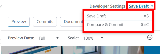 - Select Compare & Commit from the top-right dropdown to view the Commit dialog, where you can view the widget's code.