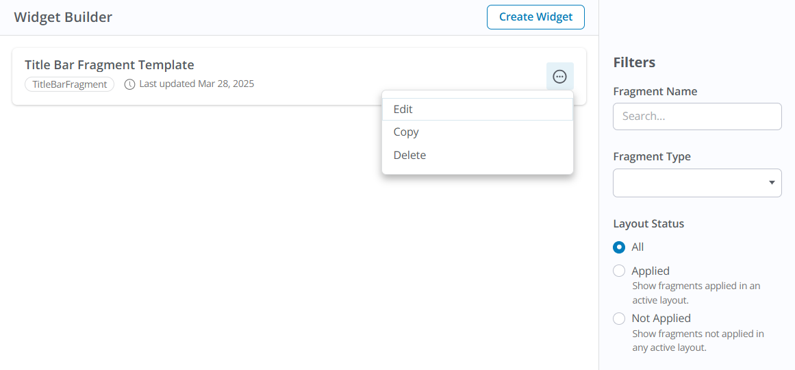 If you’re using Full Widget Builder (Enterprise or Enterprise Plus customers only), you can also create fragments that modify the appearance or behavior of existing widgets.