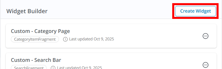 The Widget Builder page lists all of your organization's custom widgets and fragments, each with an ellipsis (…) menu allowing you to: