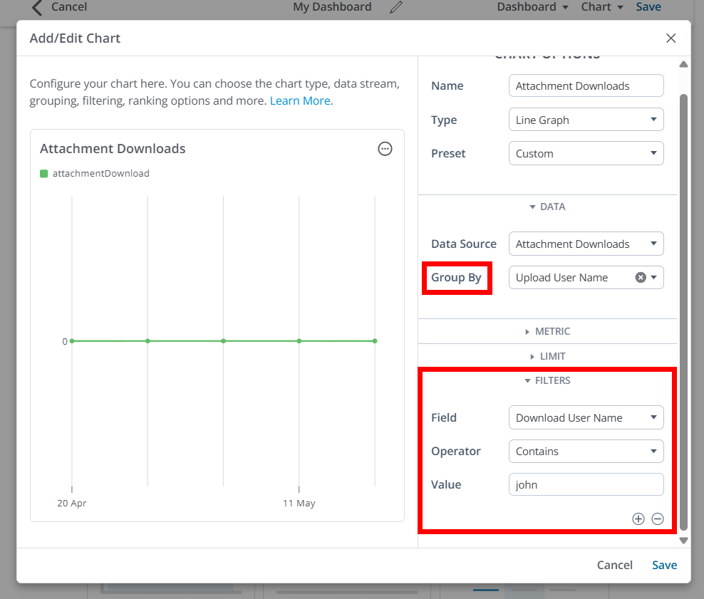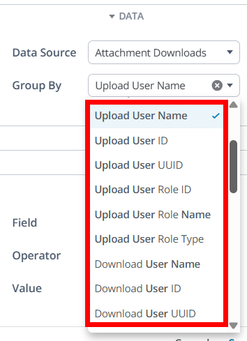 Leverage these user-based metrics to group or filter attachments by attributes of the user who downloaded or uploaded them, including username and role (and other standard user details).