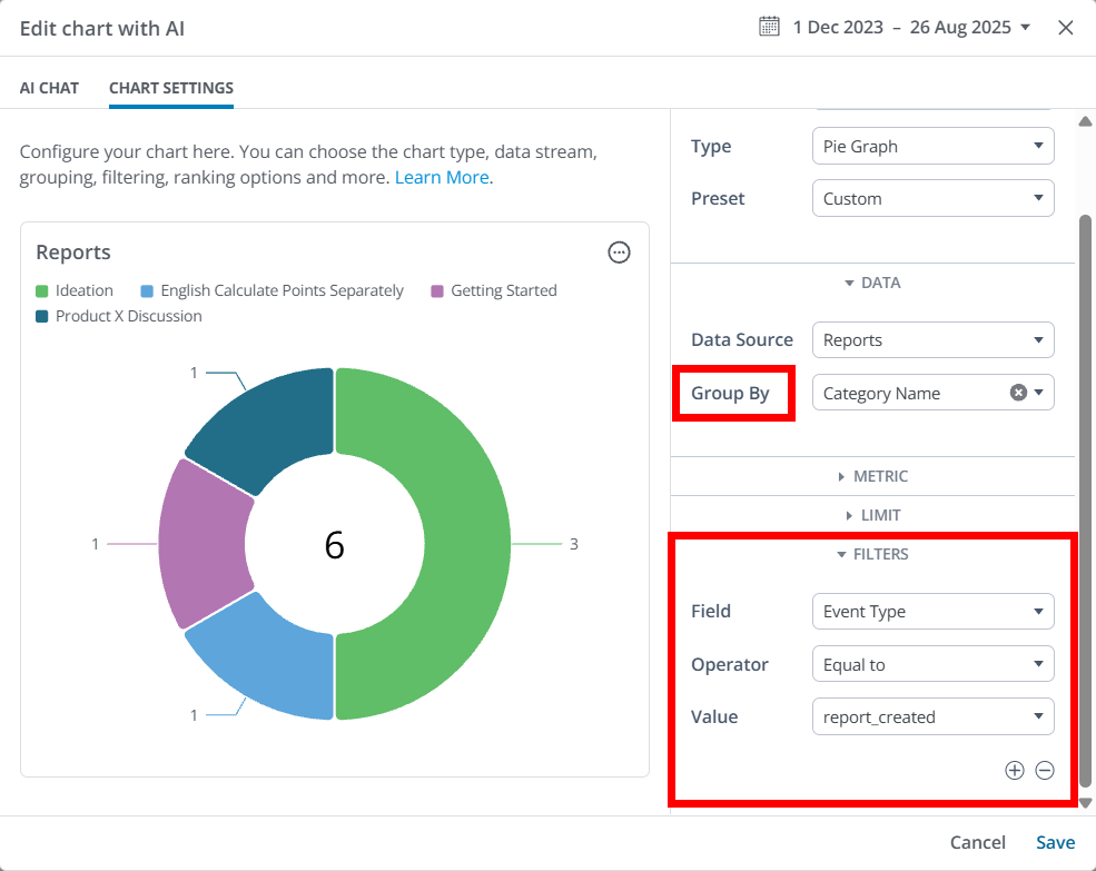 When building your own Dashboard Charts, you can pull data from various data sources to view different types of analytics events.
