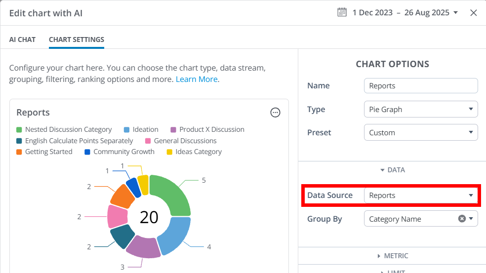 IMPORTANT: The Reports data source replaces the existing data source: Community Management Reports. Current dashboards and charts using this deprecated data source will continue to function and receive data but they will be removed in the future; because of this, we recommend migrating to the Reports data source for continued accuracy and access to improvements.