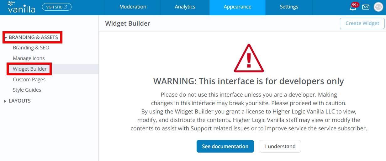 WARNING: Widget Builder is a powerful, code-first customization interface designed for developers who are skilled in JavaScript, CSS, React, and other design principles. With this in mind, make sure you possess the proper coding expertise and knowledge before using this tool—or work with someone who does. Otherwise, you may damage the integrity and functionality of your Higher Logic Vanilla (Vanilla) community.