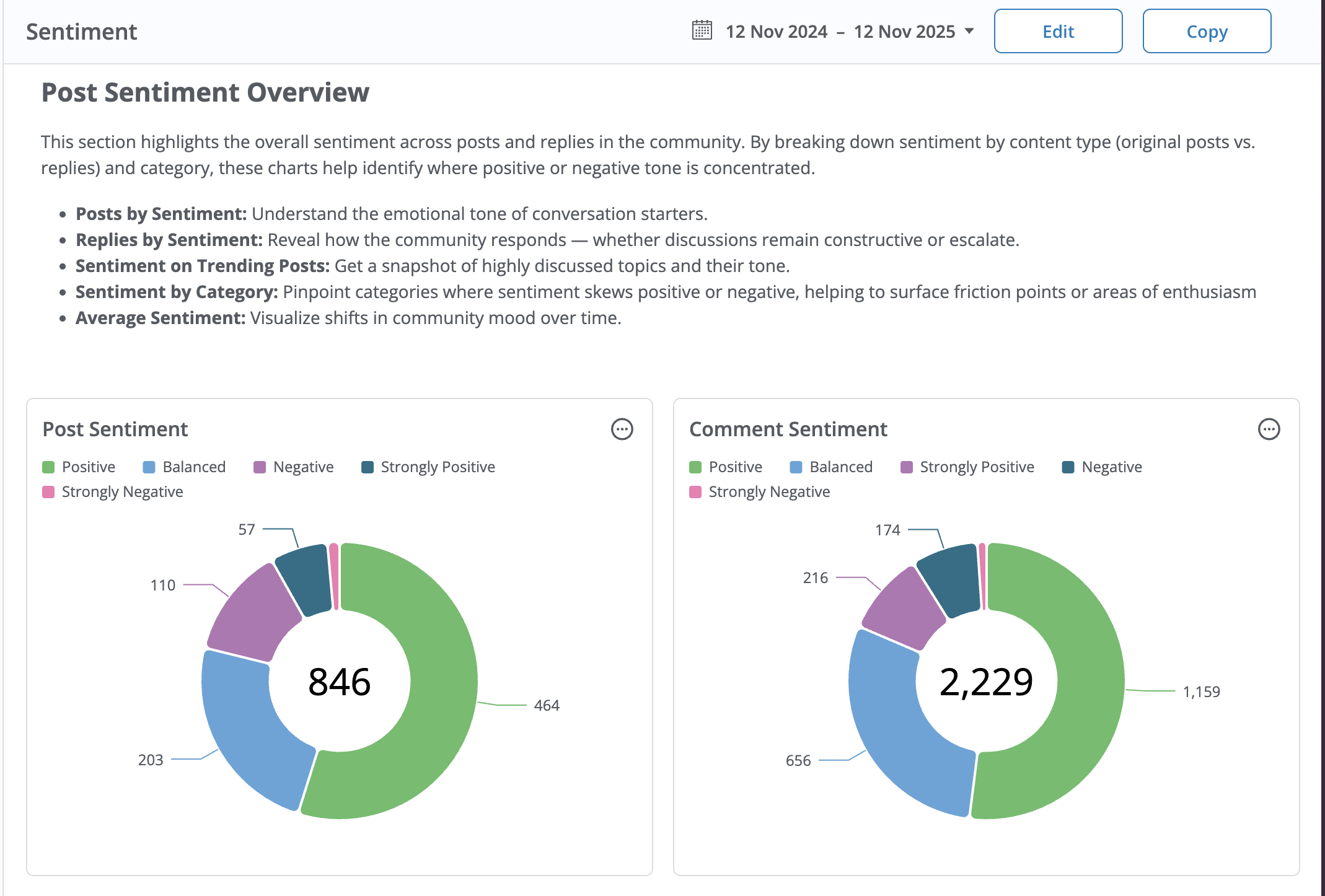 The Sentiment Analytics Dashboard has been redesigned for clarity and accuracy based on user feedback. The new version includes improved visualizations and clear help text explaining what each chart represents. It now features distinct views for post-level, member-level, and interaction-level sentiment, with metrics based on averages rather than outliers—providing a more balanced, trustworthy picture of community tone.