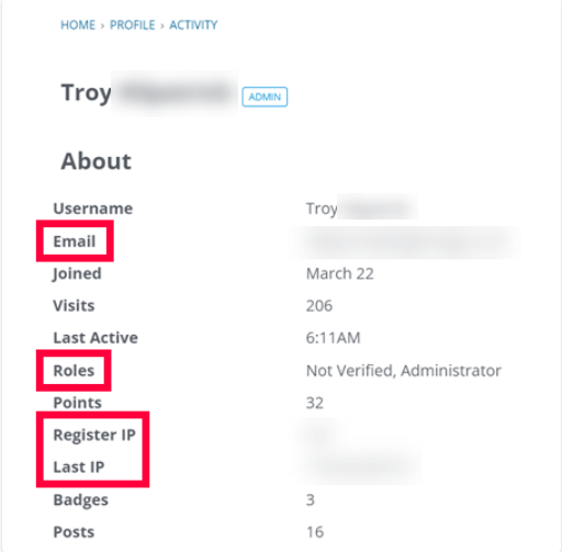A user's email address and IP address are considered "personal info," and are only visible to users with the Garden > Personal Info > View