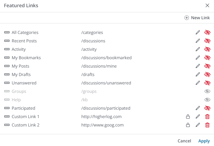 - Click a tab's pencil icon to display the Edit dialog, where you can select the content it will display in your community, as well as its label.